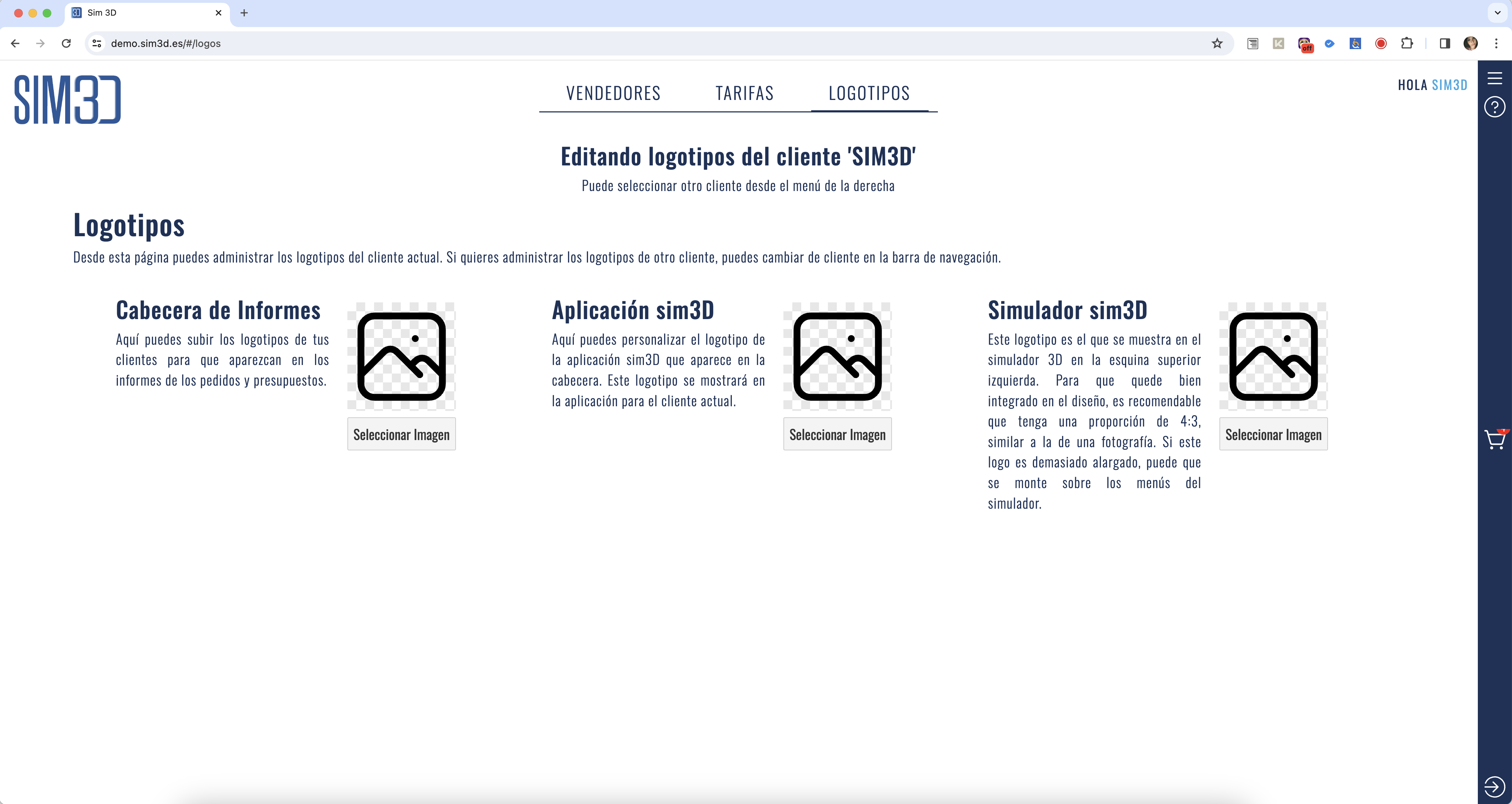 Con el módulo integrado de administración de imágenes, sim3D te permite subir y administrar imágenes para poder personalizar desde la página de configuración, los logotipos del cliente actual.
